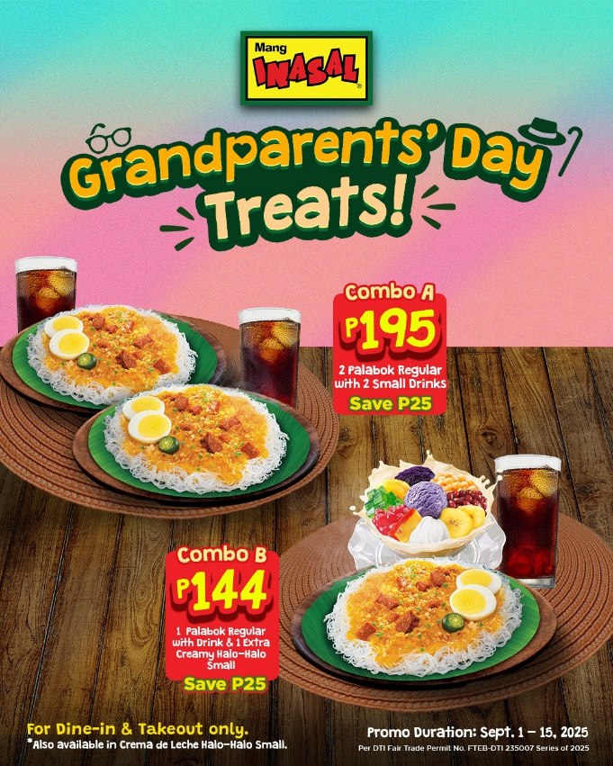 From September 1 to 15, 2025, diners can enjoy the Grandparents’ Day Treat, featuring two Palabok Regulars with two Small Drinks for ₱195 or one Palabok Regular with a drink and one Extra Creamy Halo-Halo Small for ₱144, saving P25 on either option. Fans of sweet treats can also choose the Crema de Leche Halo-Halo Small as an alternative to the Extra Creamy Halo-Halo.